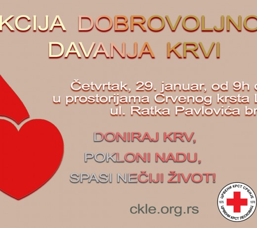 Poštovani prijatelji, I ovog četvrtka, Crveni krst Leskovac i Zavod za transfuziju krvi NIš nastavljaju sa redovnim akcijama dobrovoljnog davanja krvi. Sutra, 22. …