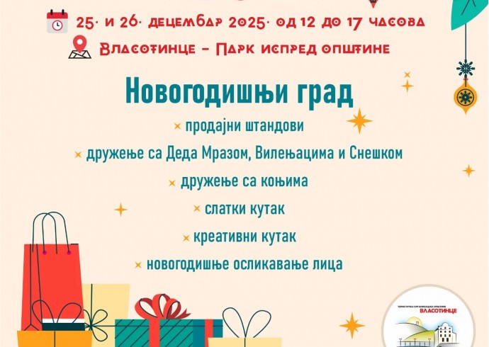 У четвртак и петак 25. и 26.децембра, од 12 до 17 сати, на платоу и у парку испред зграде општине у Власотинцу, одржаће се традиционални Новогодишњи базар. У оквиру њега биће постављен Новогодишњи град. Малишани ће моћи да се друже са Деда Мразом, вилењацима и Снешком, али и са коњима, кажу у Туристичкој организацији и подсећају суграђане да ће и ове године штандови бити пуни рукотворима са празничним мотивима, који могу да буду лепи поклони драгим људима. Овај, као и претходни новогодишњи базари у Власотинцу, има хуманитарни карактер. Новчани прилози и део прихода од продаје рукотворина намењени су малој Нади Станковић из Бољара. Организатор Новогодишњег базара је Туристичка организација општине Власотинце.